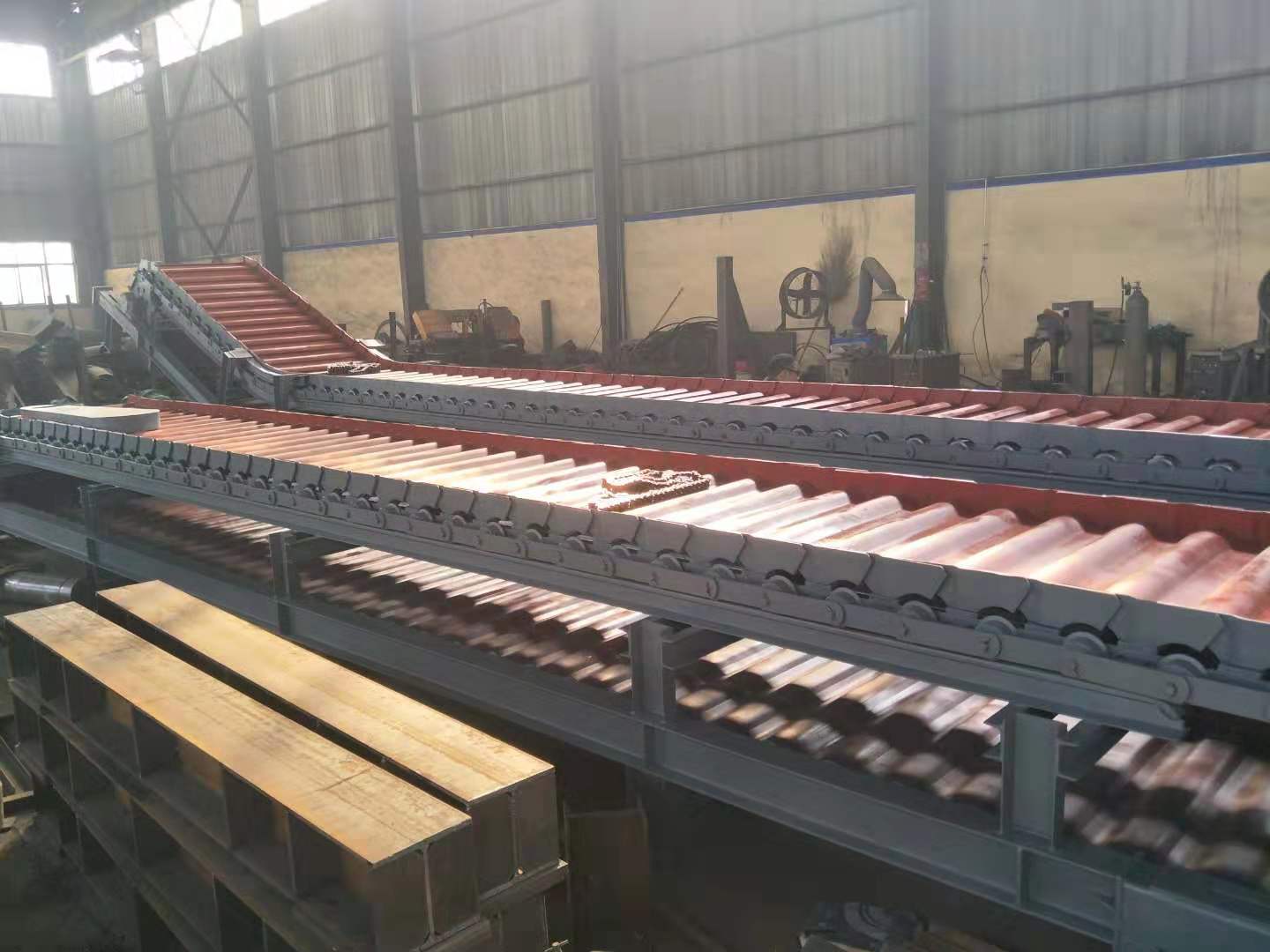 鏈板輸送機是一種以標準鏈板為承載面,由馬達減速機為動力傳動的傳送裝置。鏈板式輸送機,由動力裝置(電機)、傳動軸、滾筒、張緊裝置、鏈輪、鏈條、軸承、潤滑劑、鏈板等等構成。其中帶動物料的輸送的主要的兩個部分為:鏈條,利用它的循環往復運動提供牽引動力;金屬板,作為輸送過程中的承載體。可以通過多列鏈板并行,使鏈板輸送機做的很寬并形成差速,利用多列鏈板的速度差使多列...